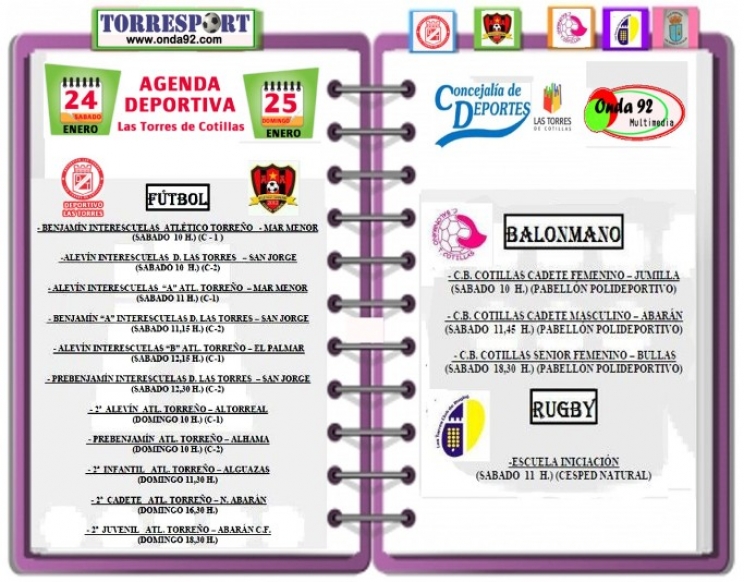 Todas las semanas aparecerá en esta sección la Agenda Deportiva del fin de semana en Las Torres de Cotillas. Una herramienta ordenada temporalmente y por disciplinas deportivas para poder disfrutar de todo el deporte que se desarrolla en nuestra localidad.