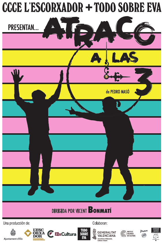 La obra «Atraco a las tres» se representará mañana viernes 19 de septiembre (22:00 horas) por el grupo Todo sobre Eva (Elche, Alicante) con entrada de 3 euros. Vicent Bonmatí, director del grupo, nos acerca a los entresijos de esta divertida obra. Es una adaptación del director de la compañía basada en la versión teatral que Blanca Suñen realizó sobre el clásico del cine español escrito por Pedro Masó.