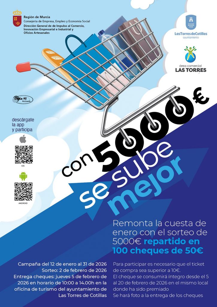 “Con 5.000 se sube mejor” es el llamativo lema de la campaña de dinamización comercial que premiará con 5.000 euros, en un sorteo de 100 cheques de 50 euros cada uno, las compras superiores a 10 euros en establecimientos asociados al Área Comercial Las Torres (ACLT).