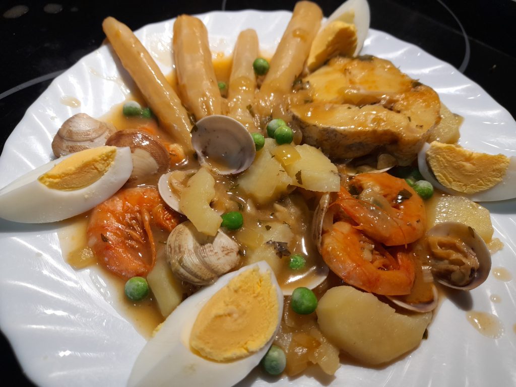 Para su elaboración, Fina utiliza rodajas de merluza o filetes limpios, acompañados de gamba roja, almejas, guisantes, espárragos y huevo cocido. El gran secreto, compartido durante el programa, es el sofrito inicial de las cabezas de las gambas, que se machacan y hierven para crear un caldo concentrado que riega después la cazuela.