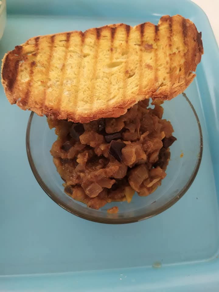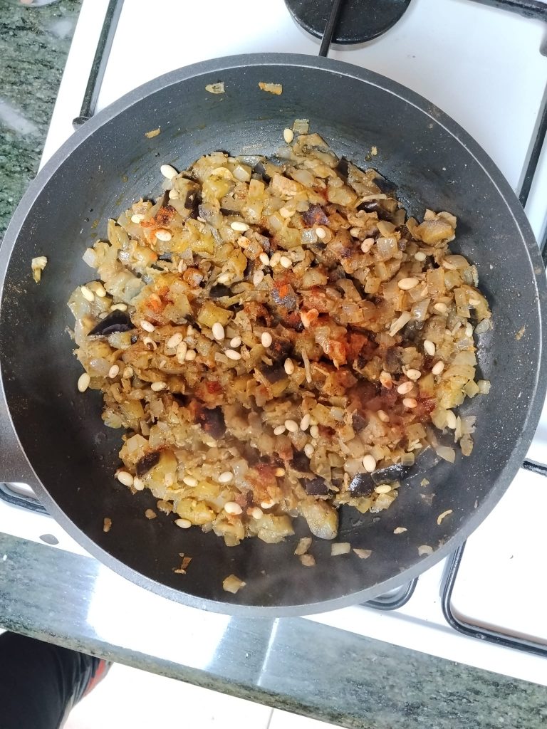 • Berenjenas y cebollas cortadas en cuadraditos.